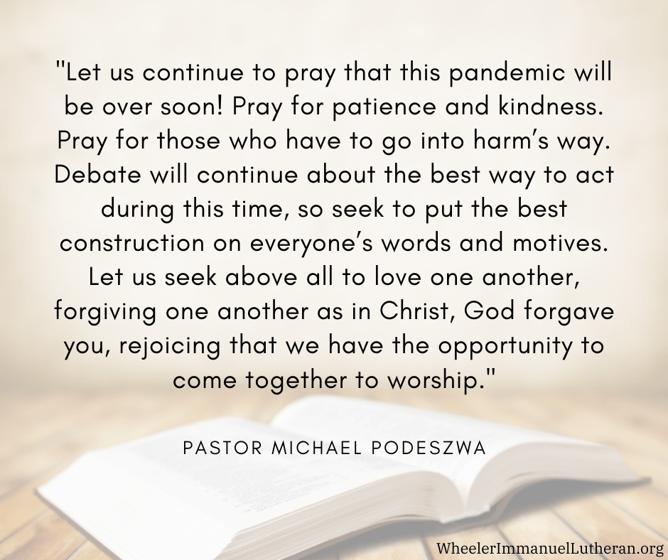 Let us continue to pray that this pandemic will be over soon! Pray for patience and kindness. Pray for those who have to go into harm’s way. Debate will continue about the best way to act during this time, so seek to put the best construction on everyone’s words and motives. Let us seek above all to love one another, forgiving one another as in Christ, God forgave you, rejoicing that we have the opportunity to come together to worship.